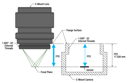 The C mount has a flange focal distance of 17.526mm, which is the distance between the mounting flange and the image sensor or film plane. This short distance allows for flexibility in lens design and makes it compatible with a wide range of lenses, including both prime lenses and zoom lenses.
